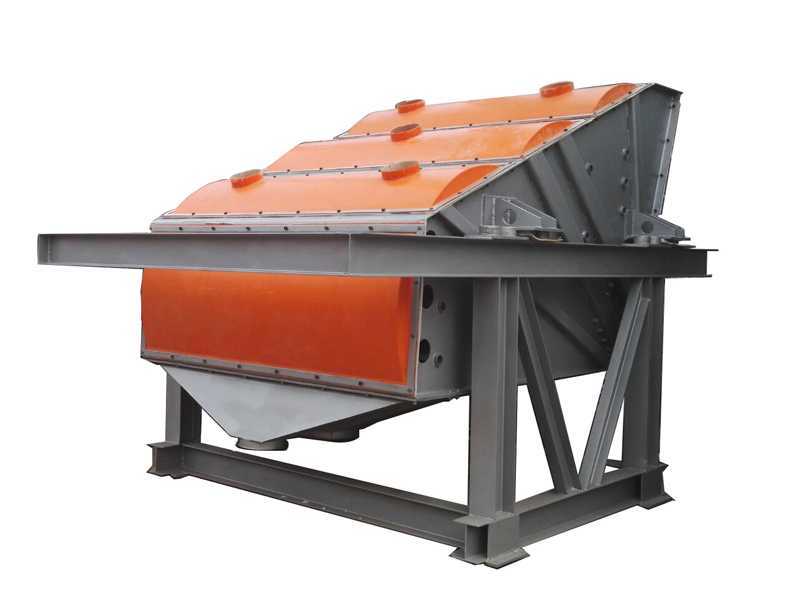 整體結構主要由這幾部分組成:帶分流裝置的進料口、支架、帶快速插銷的檢修上蓋、振動彈簧,振動電機、篩體等配件組成。振動彈簧連接在振動支架上,支撐著篩體,振動電機與篩體的安裝橋架進行布局安裝。帶快速插銷的檢修上蓋位于篩體上側,方便快捷打開上蓋查看篩網的使用情況。概率篩是根據雙振動電機自同步直線振動原理制成。在振動過程中由電機產生的縱向激振力(由于兩電機反向同步轉動橫向力抵消)使篩體沿水平面成一傾斜角度的方向作直線振動,從而使物料在篩網上向前不斷地拋物狀運動,達到篩分目的。各層篩網沿箱體傾斜不同的角度并且相互間隔一定距離進行布置。大傾角布置的篩網使得篩網在過載的情況下也不至于被撕裂。